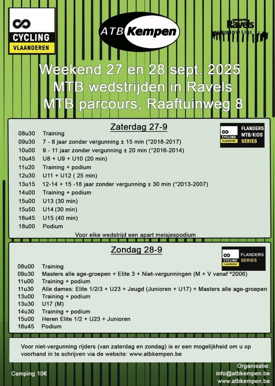 Op zaterdag 27 september worden op het parcours van ATB Kempen te Ravels de Cycling Vlaanderen MTB Kids Series gereden. (jeugd tem U15)